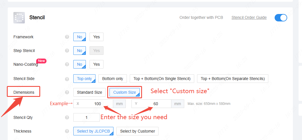 Anyone ordering a customized stencil with a size ≤100×100mm is eligible for the $3 pricing — no minimum PCB order is required.